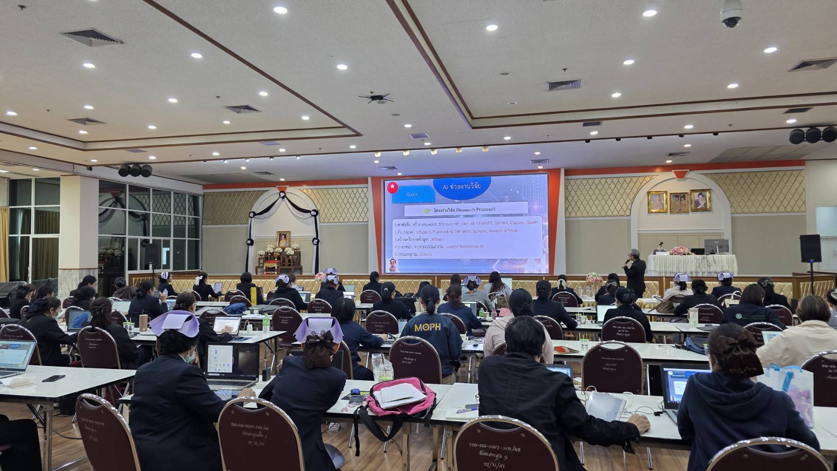 กลุ่มภารกิจด้านการพยาบาล โรงพยาบาลพระจอมเกล้า จังหวัดเพชรบุรี จัดโครงการ "อบรมการพัฒนาศักยภาพบุคลากรด้านงานวิจัย" โดยมี นางนกุมล ศรีสม หัวหน้าพยาบาล กล่าวรายงาน และนายแพทย์ สิทธิกร ลินลาวรรณ รองผู้อำนวยการด้านพัฒนาระบบบริการและสนับสนุนบริการสุขภาพ โรงพยาบาลพระจอมเกล้า จังหวัดเพชรบุรี เป็นประธานในพิธีเปิดการอบรม ในวันจันทร์ที่ 12 มกราคม 2569 ที่ผ่านมาโดยในการจัดอบรมครั้งนี้มีวัตถุประสงค์เพื่อพัฒนาความรู้ ความเข้าใจ และทักษะเกี่ยวกับกระบวนการวิจัยนอกจากนี้ยังมีการบูรณาการเทคนิค AI เข้ามาช่วยในทุกขั้นตอนของงานวิจัย ซึ่งการอบรมจัดขึ้นทั้งหมด 3 ระยะ ได้แก่ วันที่ 12-14 มกราคม 2569 วันที่ 16-18 มีนาคม 2569 และ วันที่ 27-29 เมษายน 2569 รวม 9 วัน โดยได้รับเกียรติจาก ดร.เพ็ญศรี รักษ์วงค์ และผศ.ดร.รุ่งโรจน์ พงศ์กิจวิทูร วิทยากรผู้ทรงคุณวุฒิ กลุ่มเป้าหมายที่เข้าร่วมอบรม ประกอบด้วย หัวหน้ากลุ่มงานหัวหน้าหอผู้ป่วย หัวหน้างาน พยาบาลวิชาชีพ และผู้สนใจจากหน่วยงานต่างๆภายในโรงพยาบาล